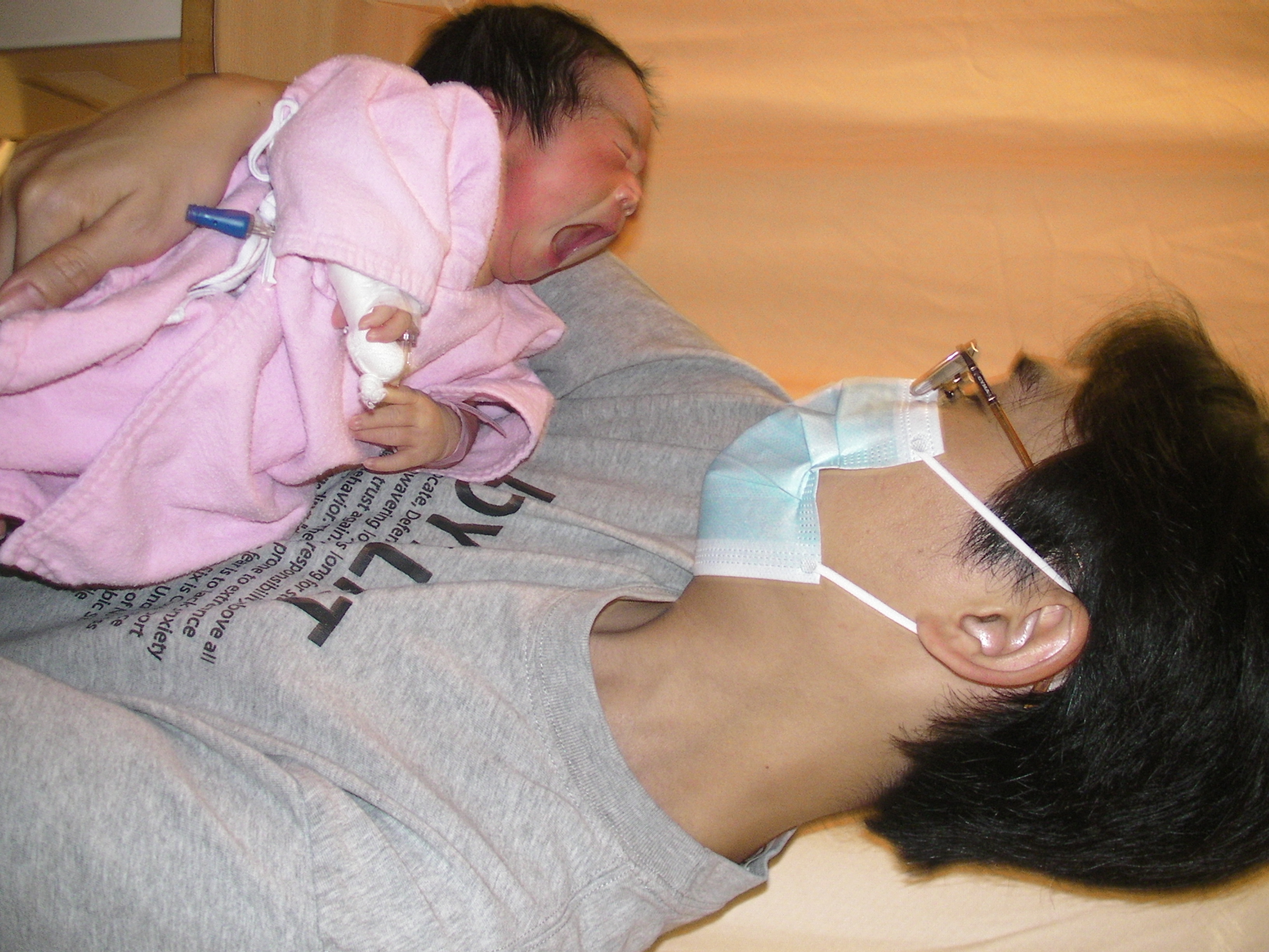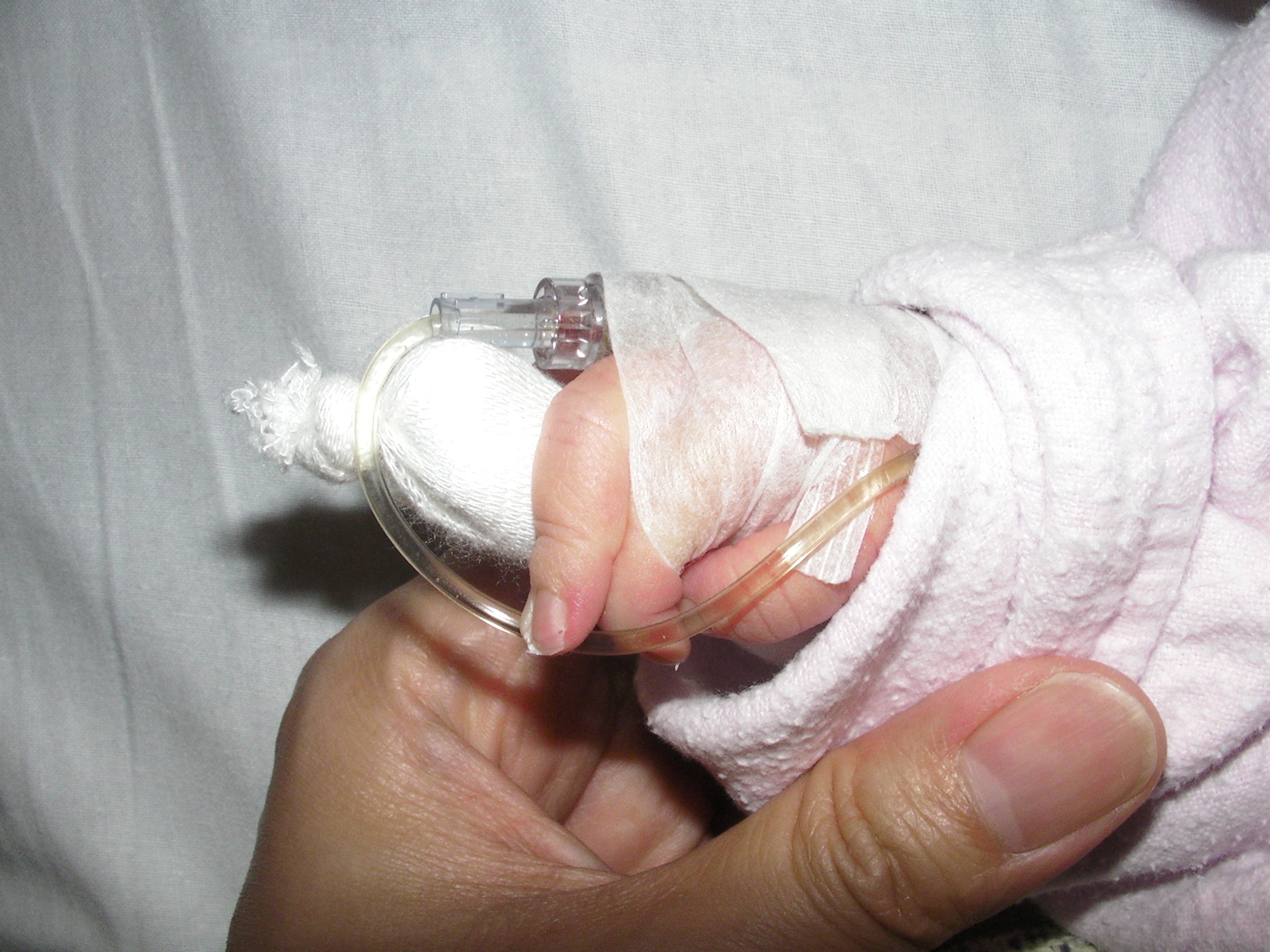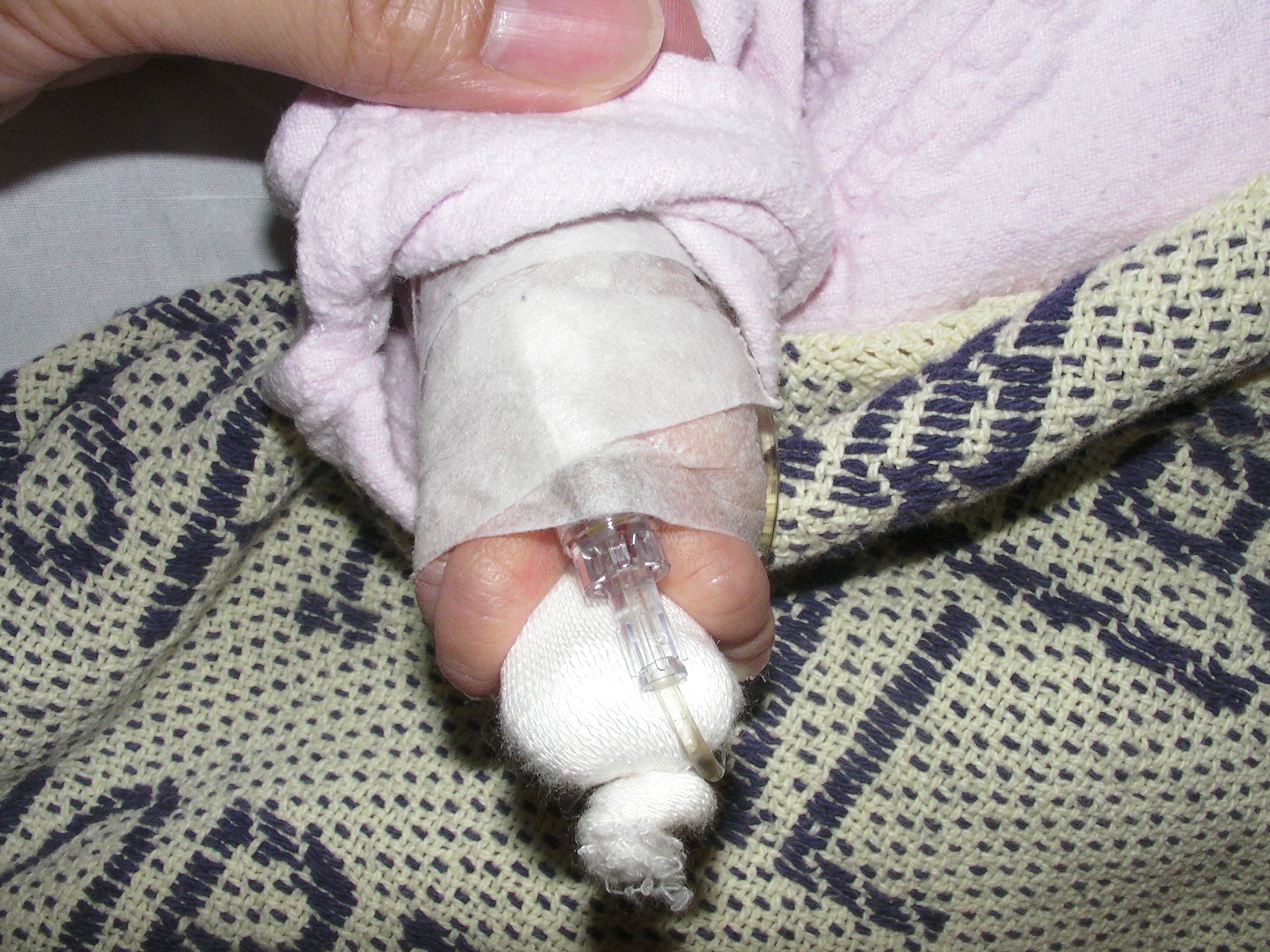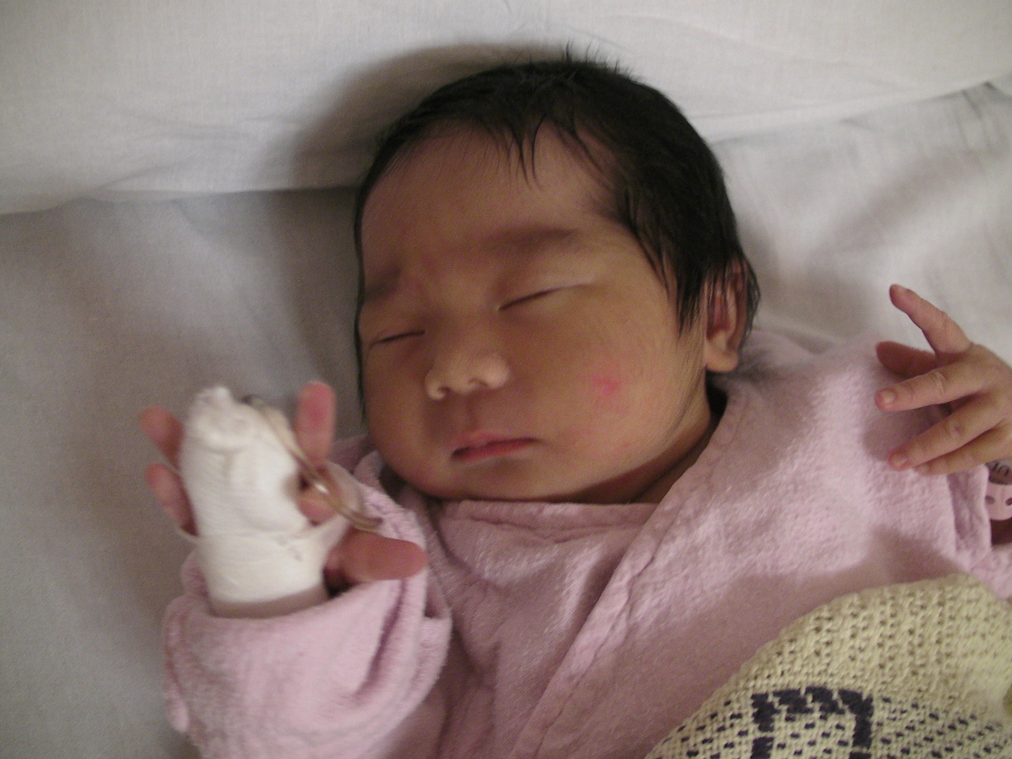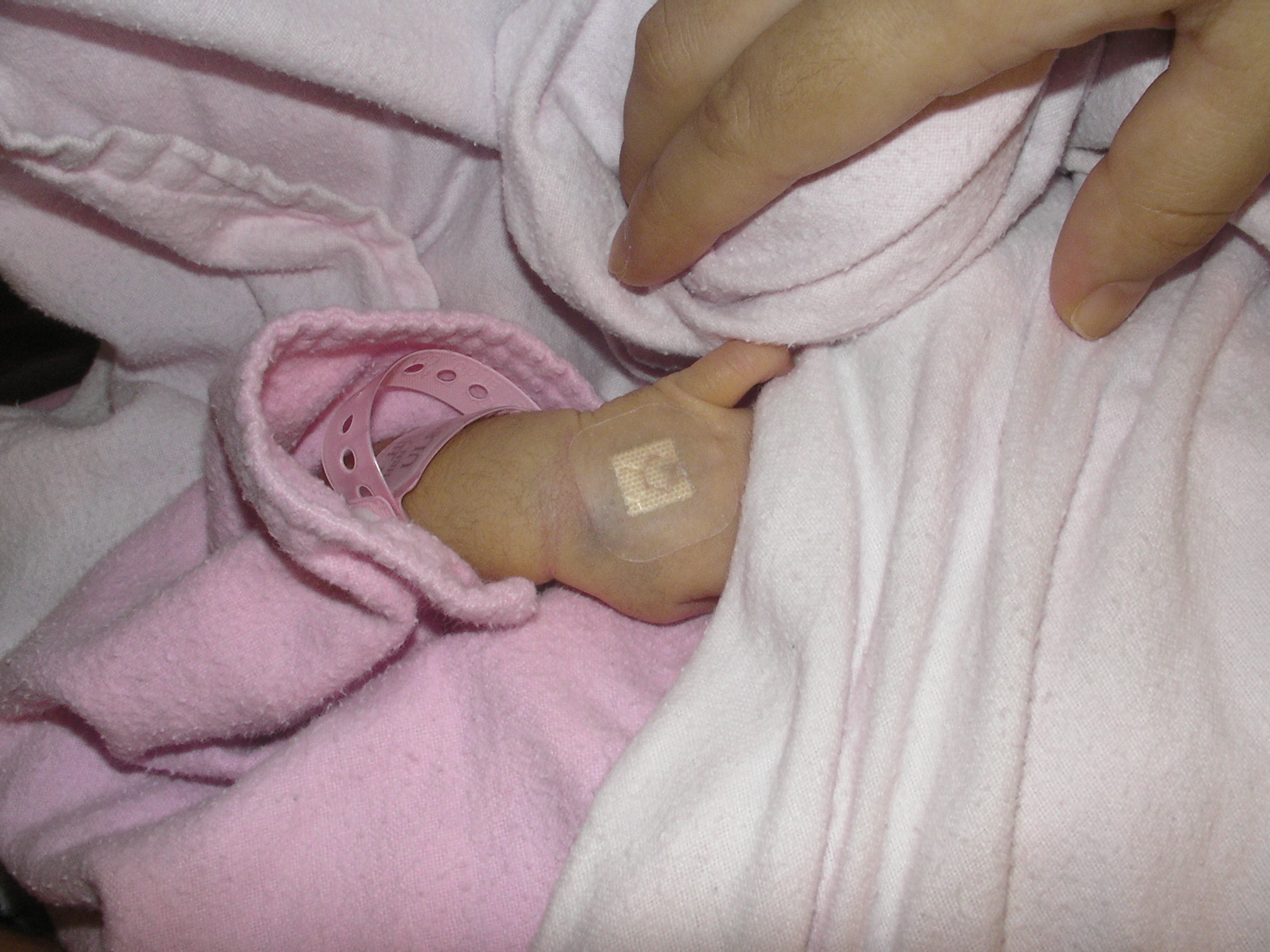 由於她轉去了兒科病房,每次只能一人探訪,加上她要長期照燈,我只能用手輕撫她的身體,照燈期間,她雙眼連頭髮都被套上厚沙布,又不能穿著衣服,只包着尿片,再看看她的小手和小腳,才發現她右腳板被打釘抽血,瘀瘀黑黑的,看見她這樣,心裏酸溜溜的 🙁 幸好她黃的程度尚少,只須照單燈。眼見很多其他嬰兒要照更強的三燈,最慘是有一個剛被推入的嬰兒已沒有三燈的位,只能用單燈頂着先!