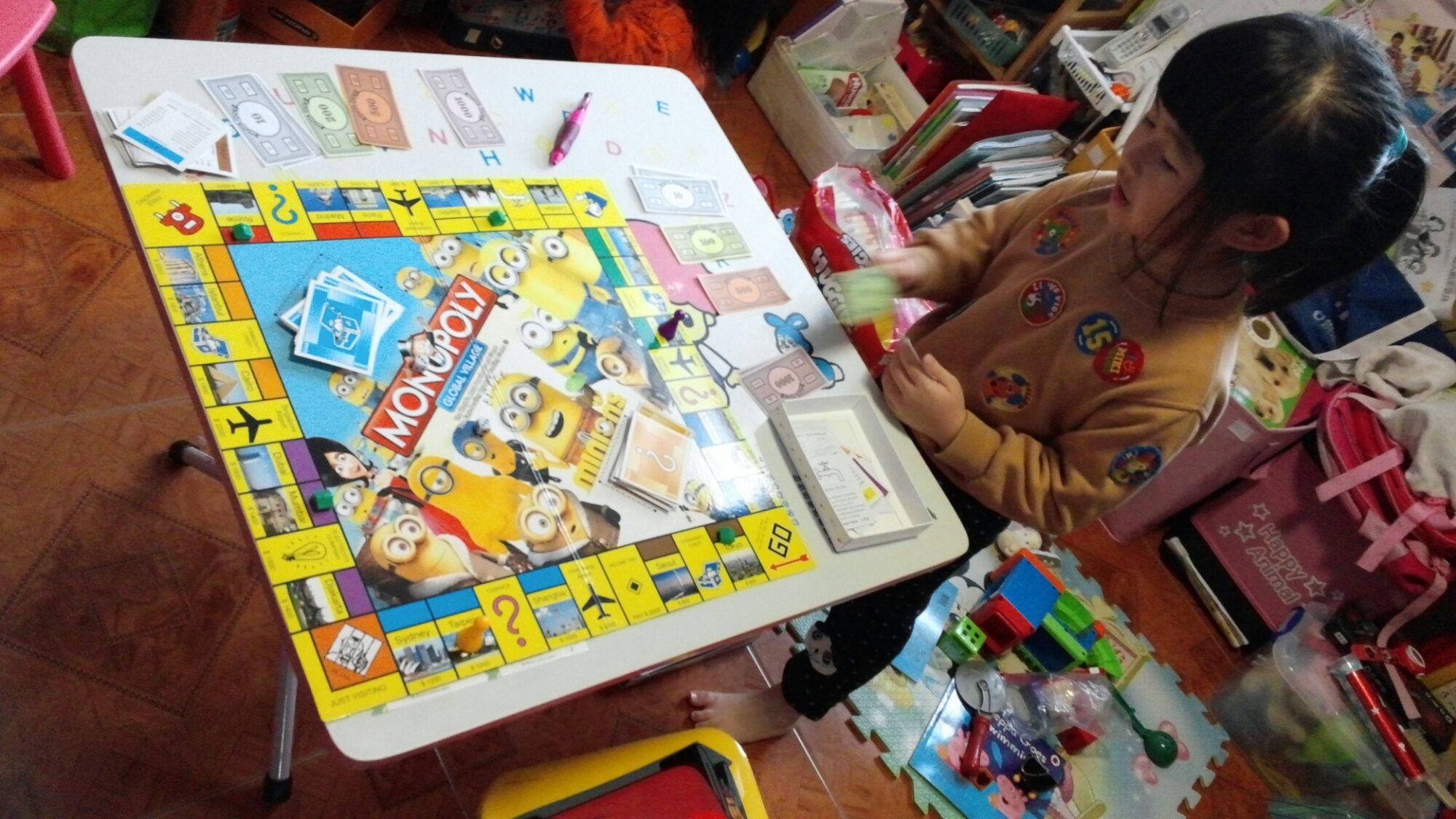 Posted on 23 December, 2015 by Irene大富翁遊戲 聖誕假期開始,昨天有些時間以琳玩大富翁。這是繼上次monopoly junior後第一副較傳統大富翁,說明表示8+歲玩,所以最初同佢解釋遊戲規則及認識銀紙時幾乎教到我暈倒! 只是教她個十佰仟,1000大元的讀法已消耗了差不多半個鐘,每行一步買地,找換金錢的解釋幾乎也要花上數分鐘。不過,見她開心我也樂意陪玩。 不過,有時最看不過眼是,點解go to jail這個指令可以用錢來出獄,這可是最難解釋的,那壞人豈不就可以用錢脫離懲罰,真說不通! 23/12/2015