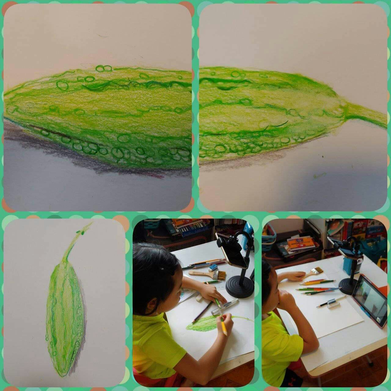 今日素描苦瓜,又zoom一zoom.平時冇機會知孩子上堂情況,在家上堂可以多一個角度觀察孩子的學習style及反應,例如會發現佢能落筆”大膽”,聽指令行動”快手”,最後部份比較難,算盡咗力!