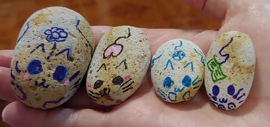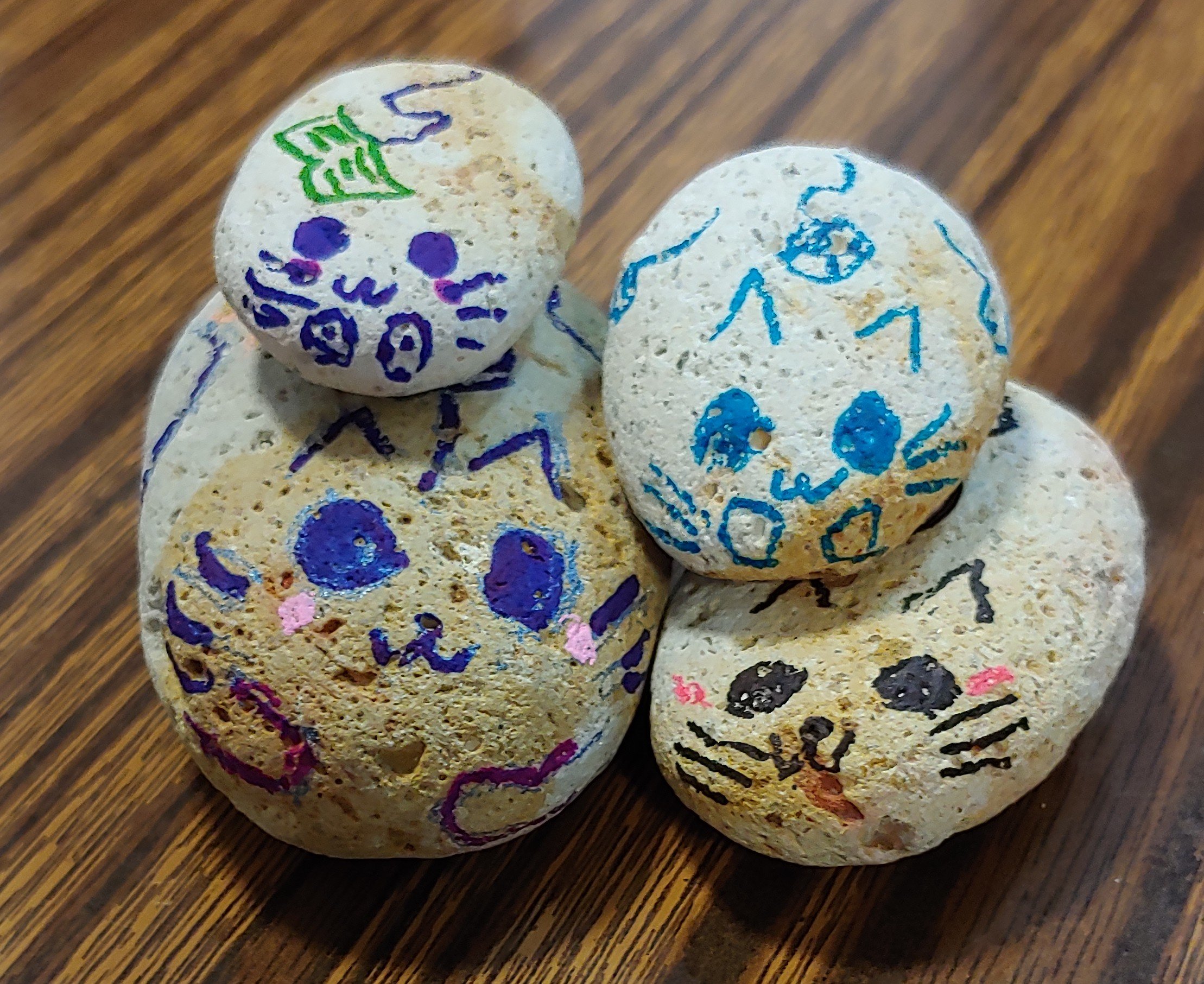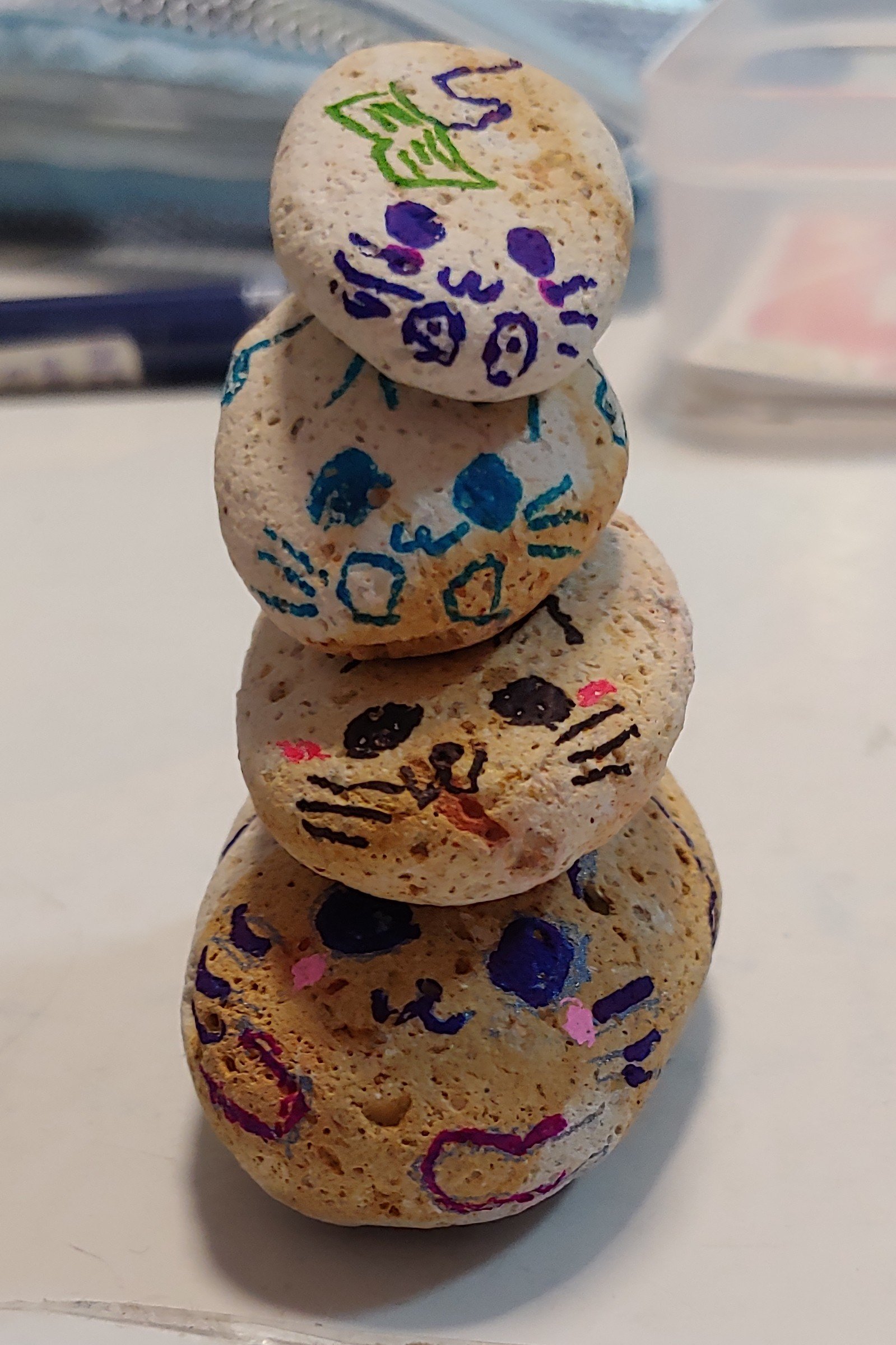 恩恩昨天在銀線灣游泳時拾了4粒小石,說它們像是我們一家人,今天還給它們畫上貓咪的樣子,說是貓精靈。
